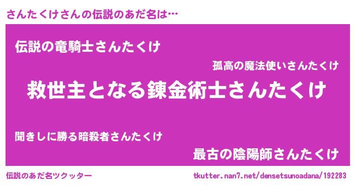 | 男性向けラノベタイトル風あだ名 | 『この素晴らしい世界にさんたくけを!』 |