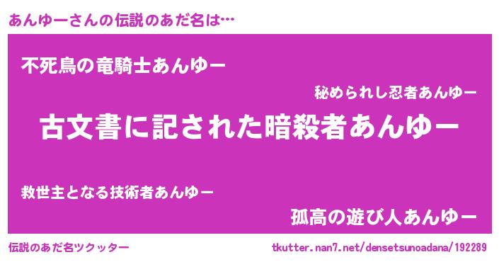 | 意味不明あだ名 | 『自称あんゆー』『永久保存あんゆー』 |