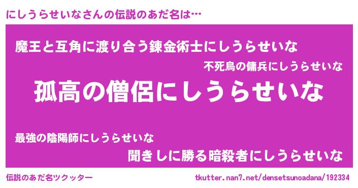 | 男性向けラノベタイトル風あだ名 | 『魔弾の王とにしうらせいな』 |