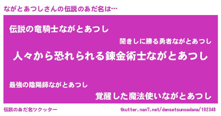 | 男性向けラノベタイトル風あだ名 | 『おまえをオタクにしてやるから、俺をながとあつしにしてくれ! 』 |