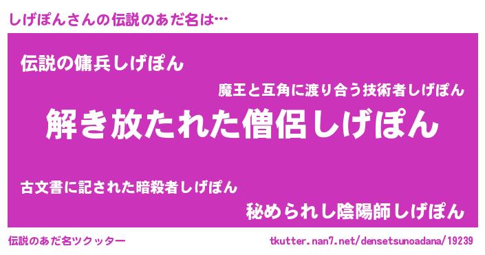| 男性向けラノベタイトル風あだ名 | 『ダンジョンにしげぽんを求めるのは間違っているだろうか』 |