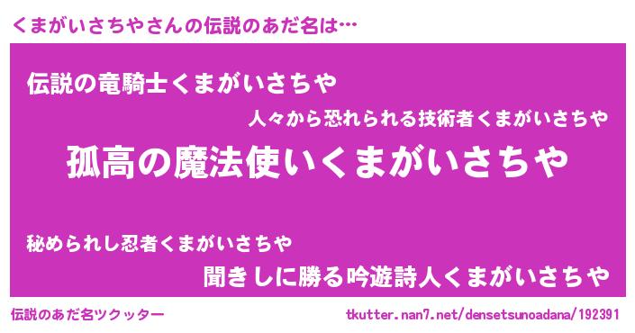 | 胡散臭い通販商品みたいなあだ名 | 『信頼と実績のサプリメント…その名も「くまがいさちや」』 |