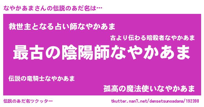| ファンタジー風あだ名 | 『エターナルナヤカアマー』『ゼナヤトゥ』 |
