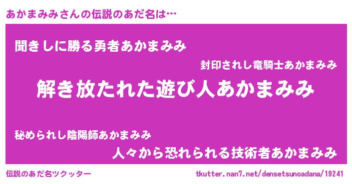 | 意味不明あだ名 | 『とにかく怪しいあかまみみ』 |
