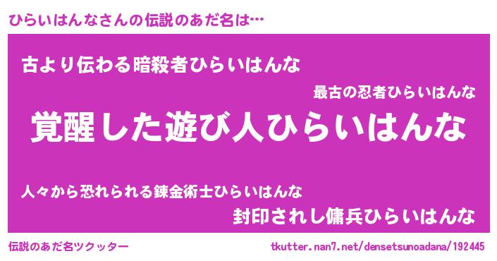 | ヒーロー風カッコイイあだ名 | 『天弓騎士ヒラ』『ネオヒライハンナ』 |