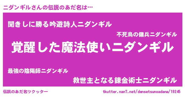 | 男性向けラノベタイトル風あだ名 | 『ニダンギルの嫁は女の子じゃないと思った?』 |