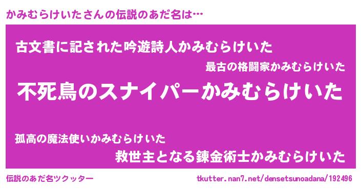 | 意味不明あだ名 | 『住所不定無職かみむらけいた(91歳)』 |