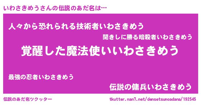 | 男性向けラノベタイトル風あだ名 | 『いわさきめう~年齢イコール彼女いない歴の魔法使い~』 |