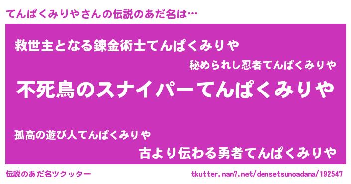 | 意味不明あだ名 | 『住所不定無職てんぱくみりや(95歳)』 |