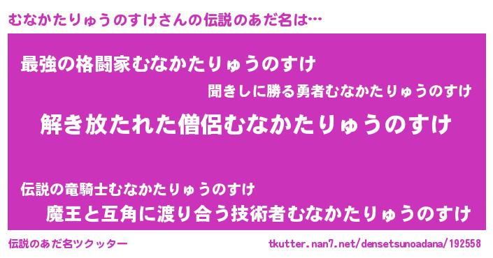 | 男性向けラノベタイトル風あだ名 | 『ダンジョンにむなかたりゅうのすけを求めるのは間違っているだろうか』 |