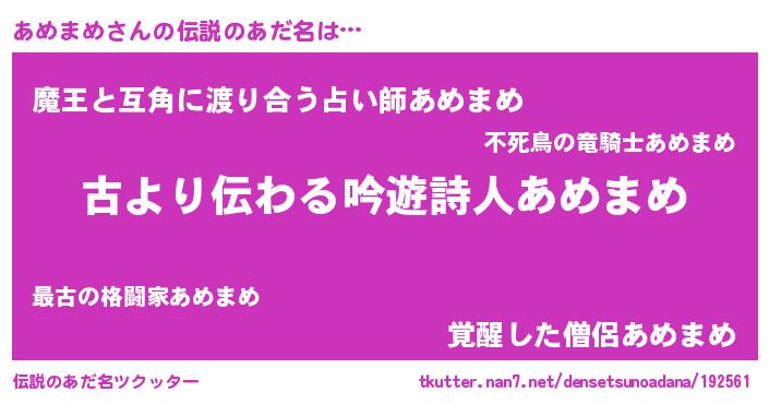 | 女子向けラノベタイトル風あだ名 | 『あめまめの契約王妃』『あめまめ恋絵巻』 |
