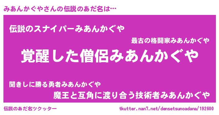 | 男性向けラノベタイトル風あだ名 | 『みあんかぐやの嫁は女の子じゃないと思った?』 |