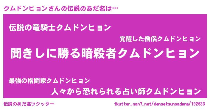 | 男性向けラノベタイトル風あだ名 | 『クムドンヒョンという概念が存在しない退屈な世界 』 |