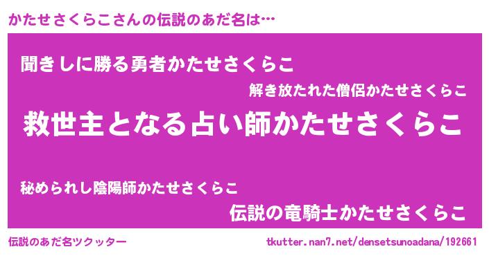 | 男性向けラノベタイトル風あだ名 | 『うちのかたせさくらこが世界を掌握している!』 |