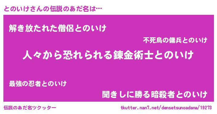 | 意味不明あだ名 | 『住所不定無職とのいけ(71歳)』 |