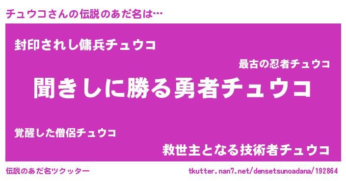 | ヒーロー風カッコイイあだ名 | 『ネオチュウコ』『スーパーチュウコ』 |