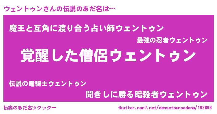 | 男性向けラノベタイトル風あだ名 | 『ウェントゥン~年齢イコール彼女いない歴の魔法使い~』 |