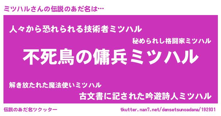 | 男性向けラノベタイトル風あだ名 | 『Re:ミツハルから始める異世界生活』 |