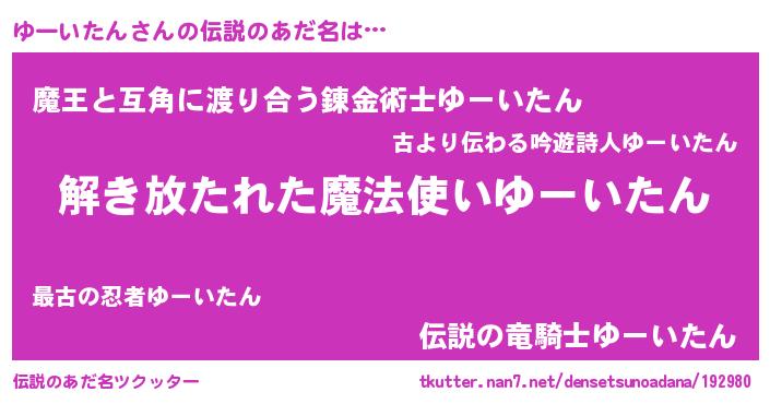 | 男性向けラノベタイトル風あだ名 | 『ゆーいたんに滅ぼされるだけの簡単なお仕事です』 |