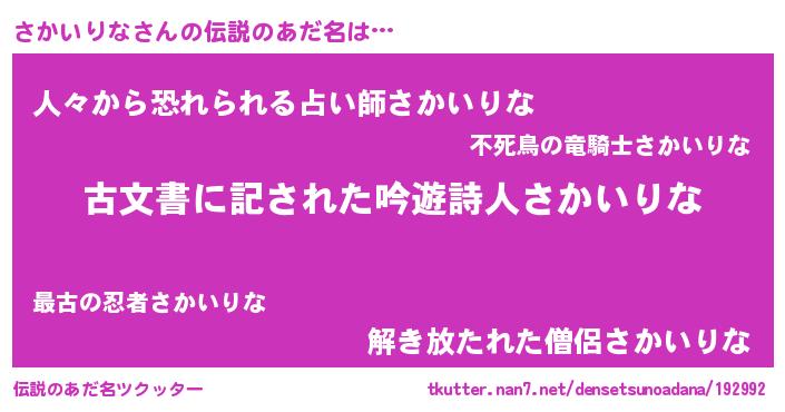 | 男性向けラノベタイトル風あだ名 | 『さかいりな~年齢イコール彼女いない歴の魔法使い~』 |
