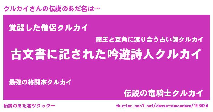 | 男性向けラノベタイトル風あだ名 | 『この素晴らしい世界にクルカイを!』 |