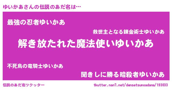 | ヒーロー風カッコイイあだ名 | 『幻影騎士ユイ』『ウルトラゆいかあマン』 |