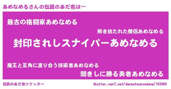 | 胡散臭い通販商品みたいなあだ名 | 『億万長者になれる霊験あらたかなお札…その名も「あめなめる」』 |