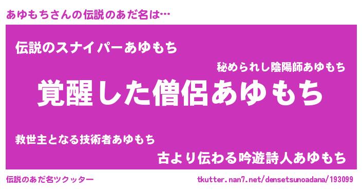 | 男性向けラノベタイトル風あだ名 | 『あゆもちの嫁は女の子じゃないと思った?』 |