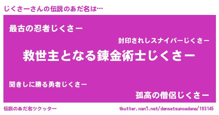| 男性向けラノベタイトル風あだ名 | 『じくさー~年齢イコール彼女いない歴の魔法使い~』 |