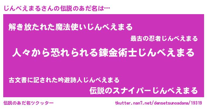 | 男性向けラノベタイトル風あだ名 | 『おまえをオタクにしてやるから、俺をじんべえまるにしてくれ! 』 |