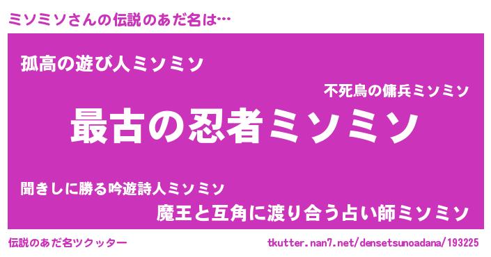 | ヒーロー風カッコイイあだ名 | 『仮面ミソダー』『ウルトラミソミソマン』 |