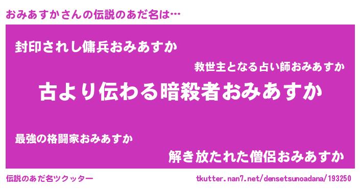 | 男性向けラノベタイトル風あだ名 | 『おみあすかという概念が存在しない退屈な世界 』 |