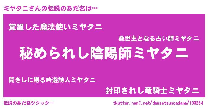 | ファンタジー風あだ名 | 『エターナルミヤタニー』『ゼミヤトゥ』 |