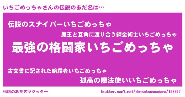 | 男性向けラノベタイトル風あだ名 | 『いちごめっちゃ~年齢イコール彼女いない歴の魔法使い~』 |