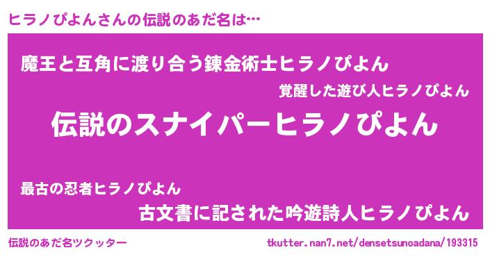 | 男性向けラノベタイトル風あだ名 | 『緋弾のヒラノピヨン』 |