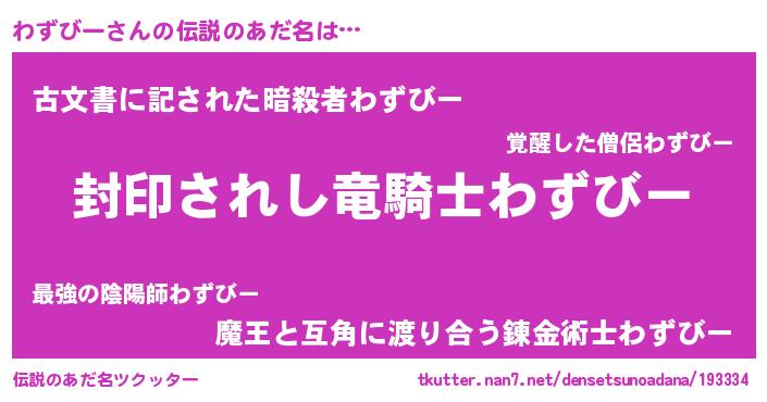 | 男性向けラノベタイトル風あだ名 | 『わずびーに滅ぼされるだけの簡単なお仕事です』 |