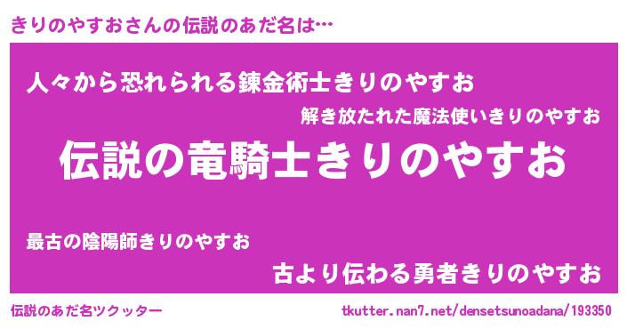 | ヒーロー風カッコイイあだ名 | 『スーパーキリノヤスオ』『魔戒騎士キリ』 |