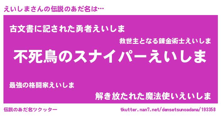| 意味不明あだ名 | 『住所不定無職えいしま(95歳)』 |