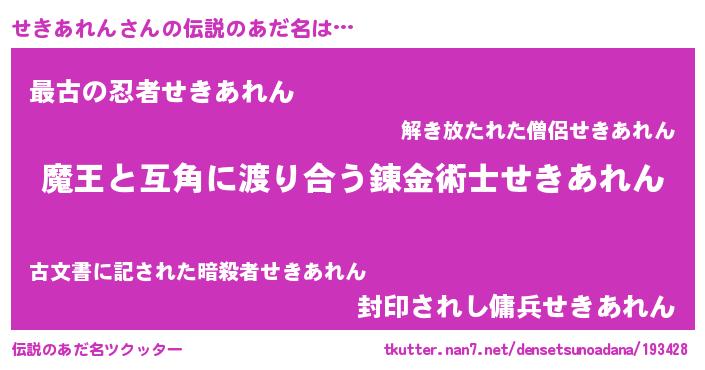| 男性向けラノベタイトル風あだ名 | 『せきあれんに滅ぼされるだけの簡単なお仕事です』 |