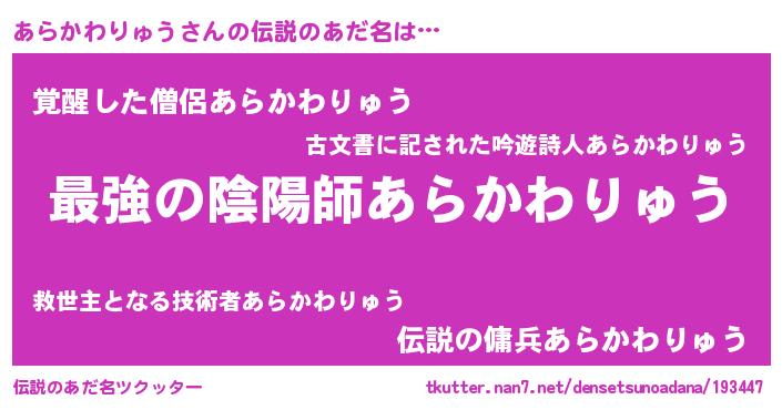 | 胡散臭い通販商品みたいなあだ名 | 『あなたにだけ特別に提供する世界で10本だけ現存している希少なブランデー…その名も「あらかわりゅう」』 |