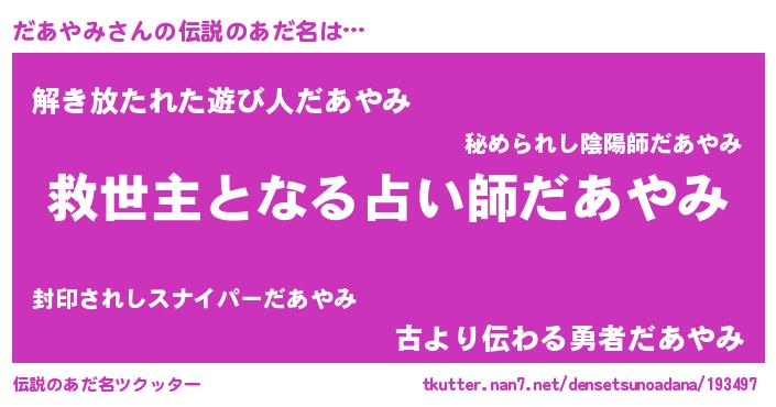 | ヒーロー風カッコイイあだ名 | 『究極戦士ダアヤミ』『愛の使者だあやみ』 |