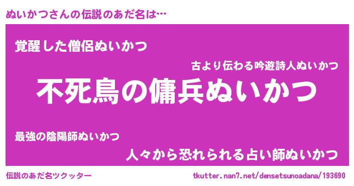| ヒーロー風カッコイイあだ名 | 『スーパーヌイカツ』『仮面ヌイダー』 |