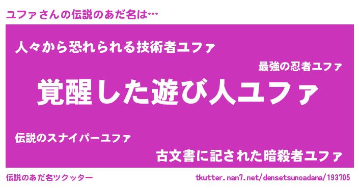 | 女子向けラノベタイトル風あだ名 | 『ユファ様がみてる』『死神ユファの再婚』 |