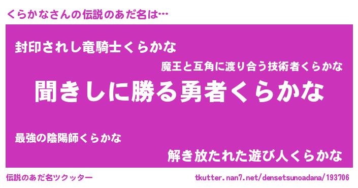 | 男性向けラノベタイトル風あだ名 | 『くらかなという概念が存在しない退屈な世界 』 |