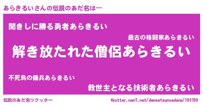 | 男性向けラノベタイトル風あだ名 | 『転生したらあらきるいだった件』 |