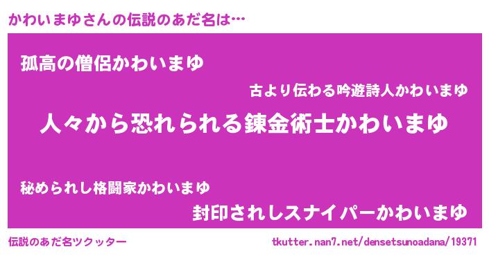 | 男性向けラノベタイトル風あだ名 | 『カワイマユスレイヤー』 |