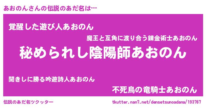 | 男性向けラノベタイトル風あだ名 | 『アオノンスレイヤー』『あおのんの憂鬱』 |