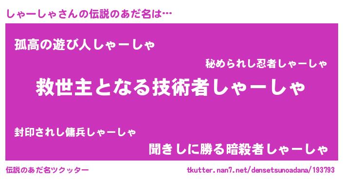 | ヒーロー風カッコイイあだ名 | 『天空の使者しゃーしゃ』『黄金騎士シャ』 |