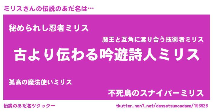| 意味不明あだ名 | 『永久保存ミリス』『ミリスフォーエバー』 |