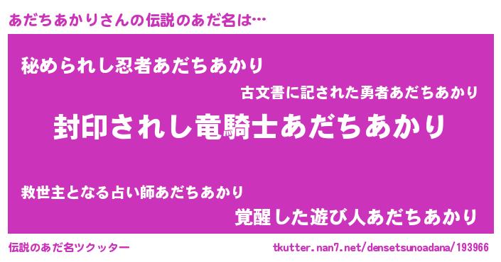 | 胡散臭い通販商品みたいなあだ名 | 『億万長者になれるブレスレット…その名も「あだちあかり」』 |